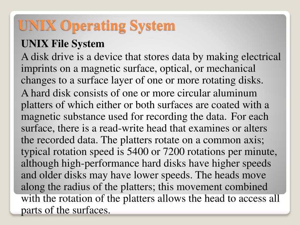 UNIX File System A disk drive is a device that stores data by making electrical imprints on a magnetic surface, optical, or mechanical changes to a surface layer of one or more rotating disks. A hard disk consists of one or more circular aluminum platters of which either or both surfaces are coated with a magnetic substance used for recording the data. For each surface, there is a read-write head that examines or alters the recorded data. The platters rotate on a common axis; typical rotation speed is 5400 or 7200 rotations per minute, although high-performance hard disks have higher speeds and older disks may have lower speeds. The heads move along the radius of the platters; this movement combined with the rotation of the platters allows the head to access all parts of the surfaces. UNIX Operating System