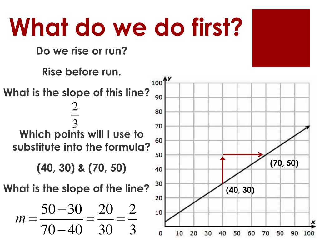 What do we do first? (70, 50) (40, 30) Do we rise or run? Rise before run. What is the slope of this line? Which points will I use to substitute into the formula? (40, 30) & (70, 50) What is the slope of the line?