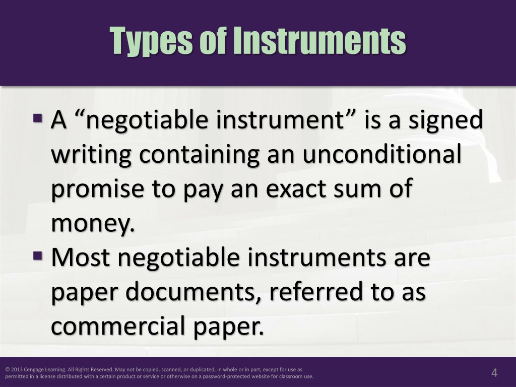 Types of Instruments • A “negotiable instrument” is a signed writing containing an unconditional promise to pay an exact sum of money. • Most negotiable instruments are paper documents, referred to as commercial paper.