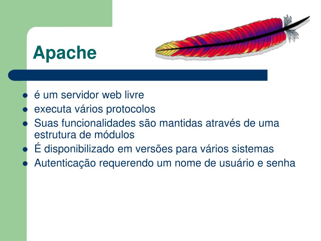 Apache • é um servidor web livre • executa vários protocolos • Suas funcionalidades são mantidas através de uma estrutura de módulos • É disponibilizado em versões para vários sistemas • Autenticação requerendo um nome de usuário e senha