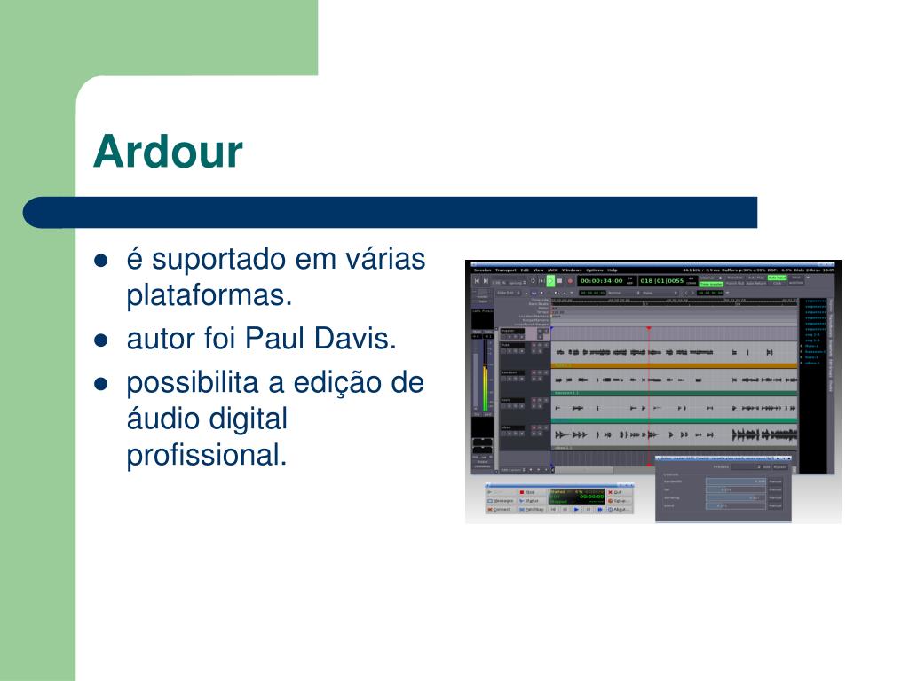 Ardour • é suportado em várias plataformas. • autor foi Paul Davis. • possibilita a edição de áudio digital profissional.