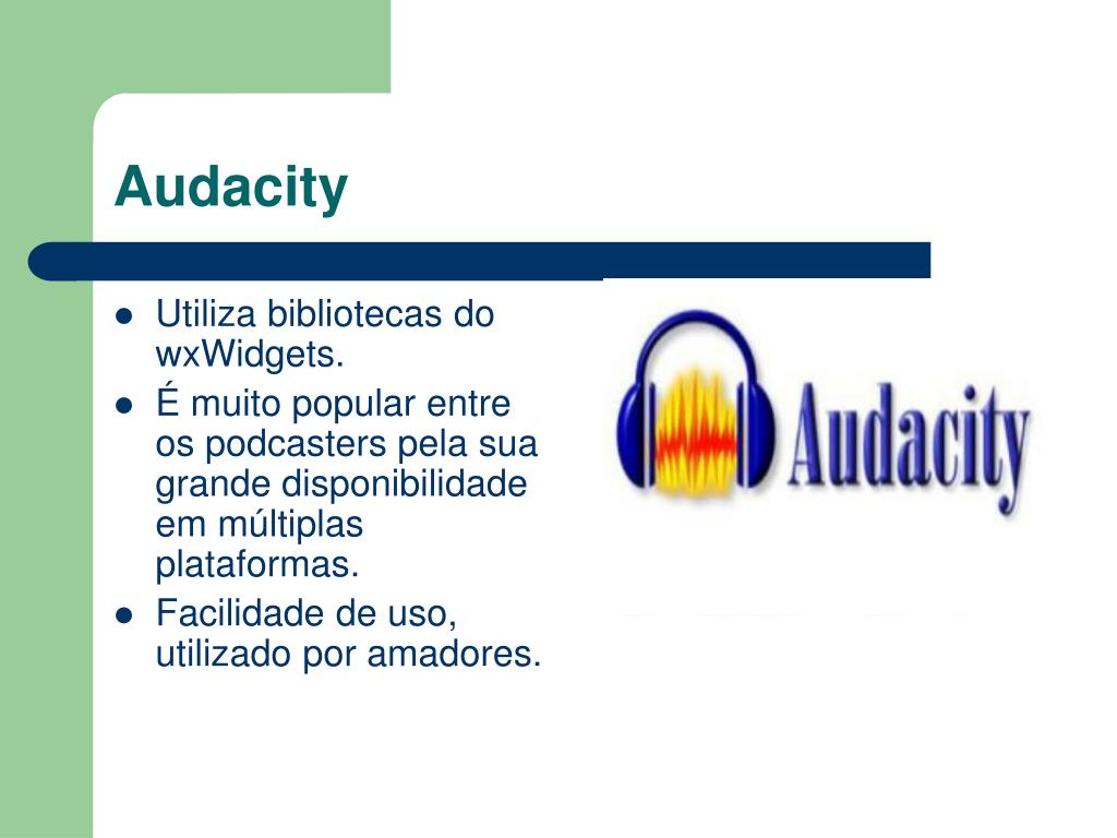 Audacity • Utiliza bibliotecas do wxWidgets. • É muito popular entre os podcasters pela sua grande disponibilidade em múltiplas plataformas. • Facilidade de uso, utilizado por amadores.