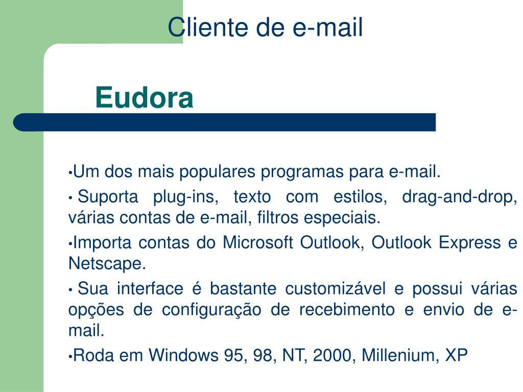 Cliente de e-mail Eudora Um dos mais populares programas para e-mail. Suporta plug-ins, texto com estilos, drag-and-drop, várias contas de e-mail, filtros especiais. Importa contas do Microsoft Outlook, Outlook Express e Netscape. Sua interface é bastante customizável e possui várias opções de configuração de recebimento e envio de e-mail. Roda em Windows 95, 98, NT, 2000, Millenium, XP