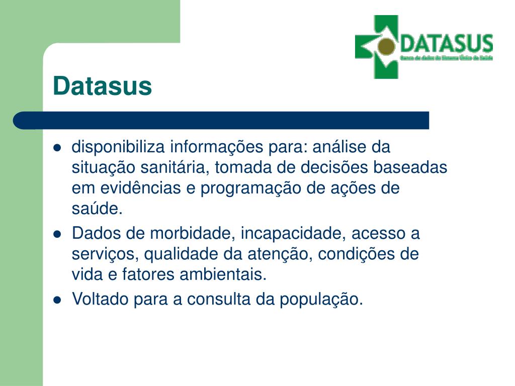 Datasus • disponibiliza informações para: análise da situação sanitária, tomada de decisões baseadas em evidências e programação de ações de saúde. • Dados de morbidade, incapacidade, acesso a serviços, qualidade da atenção, condições de vida e fatores ambientais. • Voltado para a consulta da população.