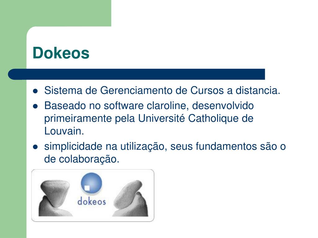 Dokeos • Sistema de Gerenciamento de Cursos a distancia. • Baseado no software claroline, desenvolvido primeiramente pela Université Catholique de Louvain. • simplicidade na utilização, seus fundamentos são o de colaboração.