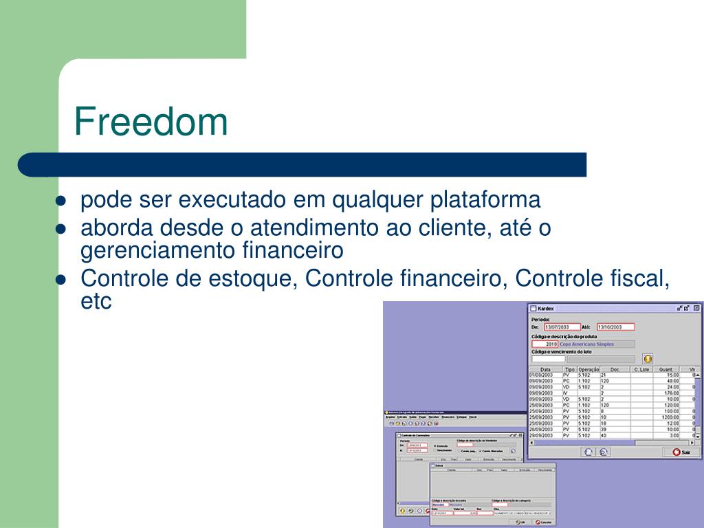 Freedom • pode ser executado em qualquer plataforma • aborda desde o atendimento ao cliente, até o gerenciamento financeiro • Controle de estoque, Controle financeiro, Controle fiscal, etc