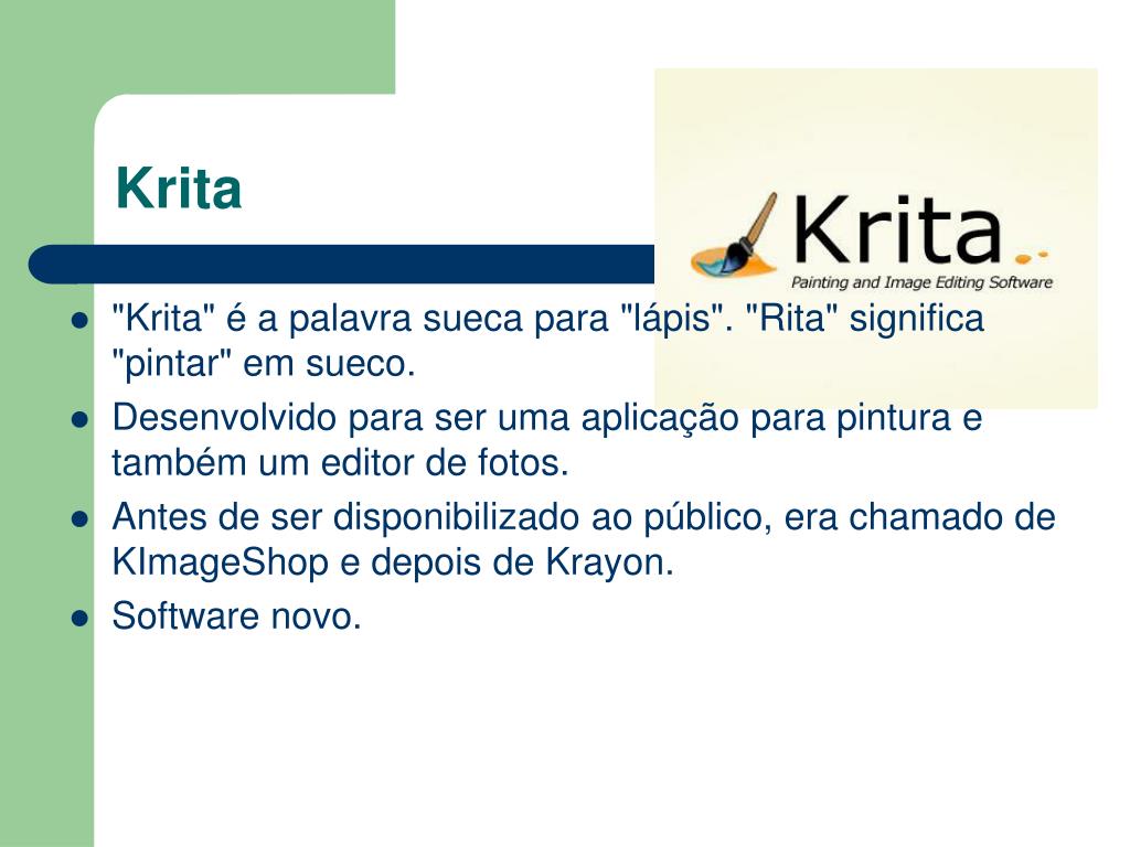 Krita • "Krita" é a palavra sueca para "lápis". "Rita" significa "pintar" em sueco. • Desenvolvido para ser uma aplicação para pintura e também um editor de fotos. • Antes de ser disponibilizado ao público, era chamado de KImageShop e depois de Krayon. • Software novo.