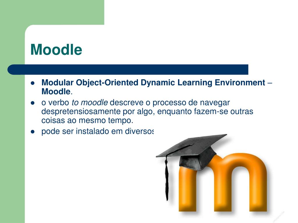 Moodle • Modular Object-Oriented Dynamic Learning Environment – Moodle. • o verbo to moodle descreve o processo de navegar despretensiosamente por algo, enquanto fazem-se outras coisas ao mesmo tempo. • pode ser instalado em diversos ambientes.
