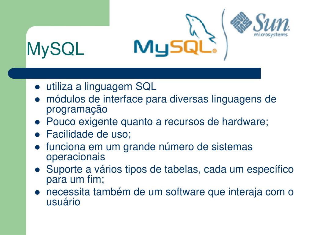 MySQL • utiliza a linguagem SQL • módulos de interface para diversas linguagens de programação • Pouco exigente quanto a recursos de hardware; • Facilidade de uso; • funciona em um grande número de sistemas operacionais • Suporte a vários tipos de tabelas, cada um específico para um fim; • necessita também de um software que interaja com o usuário
