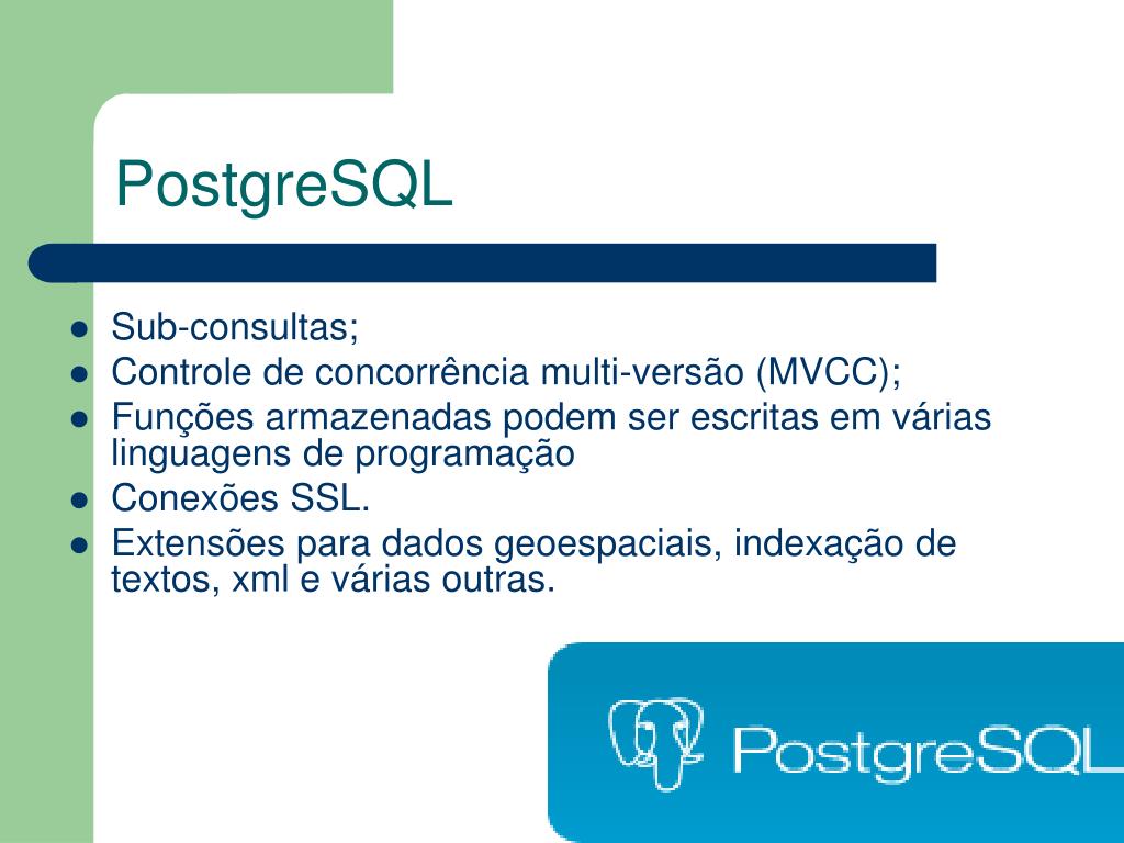 PostgreSQL • Sub-consultas; • Controle de concorrência multi-versão (MVCC); • Funções armazenadas podem ser escritas em várias linguagens de programação • Conexões SSL. • Extensões para dados geoespaciais, indexação de textos, xml e várias outras.