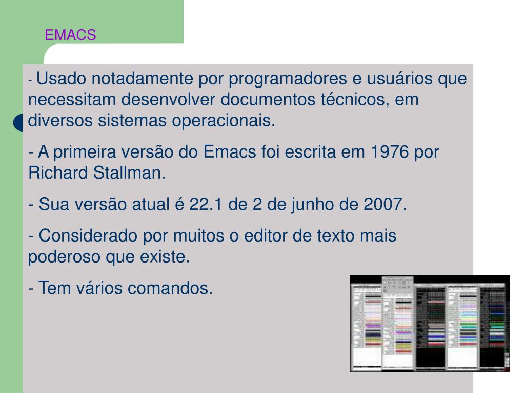 EMACS • Usado notadamente por programadores e usuários que necessitam desenvolver documentos técnicos, em diversos sistemas operacionais. • A primeira versão do Emacs foi escrita em 1976 por Richard Stallman. • Sua versão atual é 22.1 de 2 de junho de 2007. • Considerado por muitos o editor de texto mais poderoso que existe. • Tem vários comandos.
