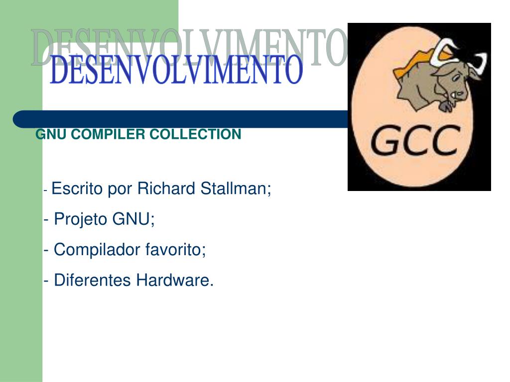 DESENVOLVIMENTO GNU COMPILER COLLECTION • Escrito por Richard Stallman; • Projeto GNU; • Compilador favorito; • Diferentes Hardware.