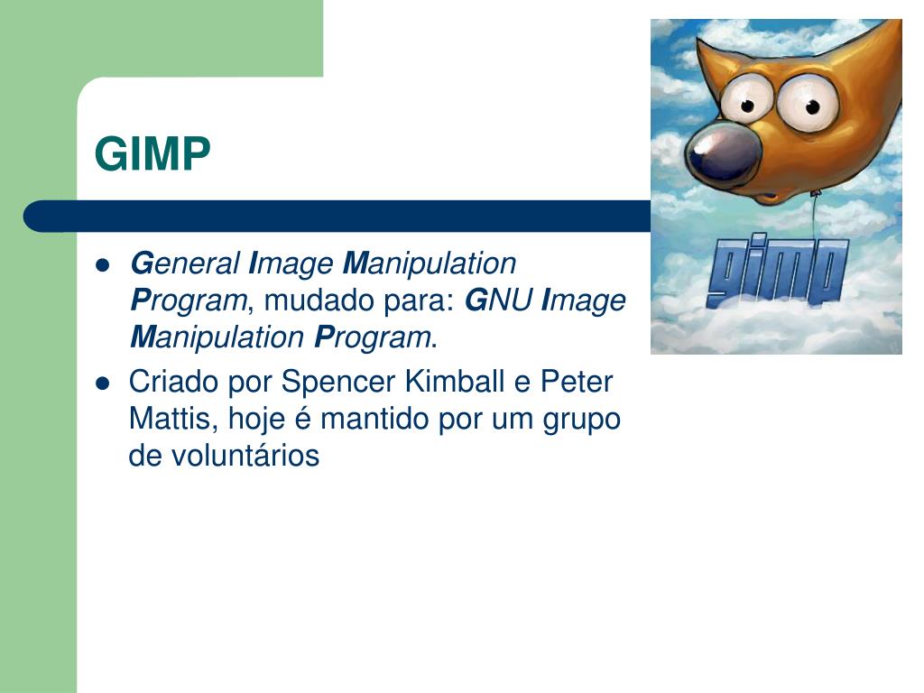 GIMP • General Image Manipulation Program, mudado para: GNU Image Manipulation Program. • Criado por Spencer Kimball e Peter Mattis, hoje é mantido por um grupo de voluntários