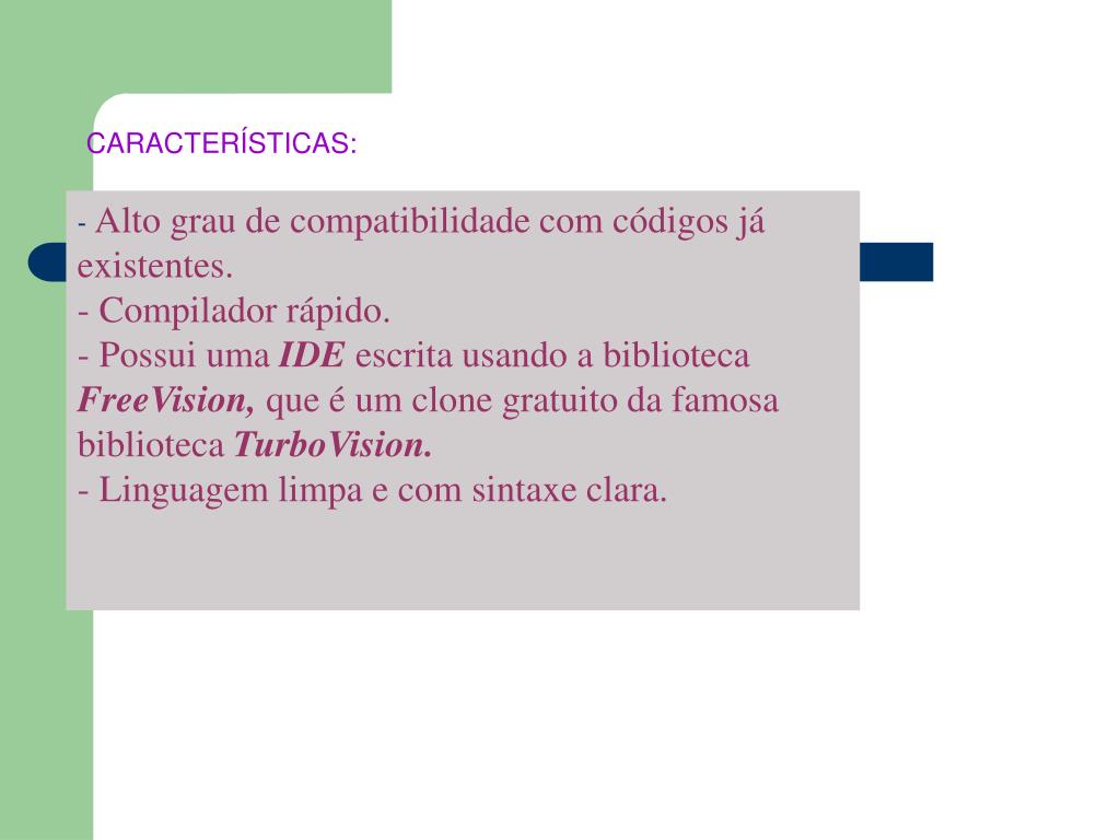 CARACTERÍSTICAS: - Alto grau de compatibilidade com códigos já existentes. - Compilador rápido. - Possui uma IDE escrita usando a biblioteca FreeVision, que é um clone gratuito da famosa biblioteca TurboVision. - Linguagem limpa e com sintaxe clara.