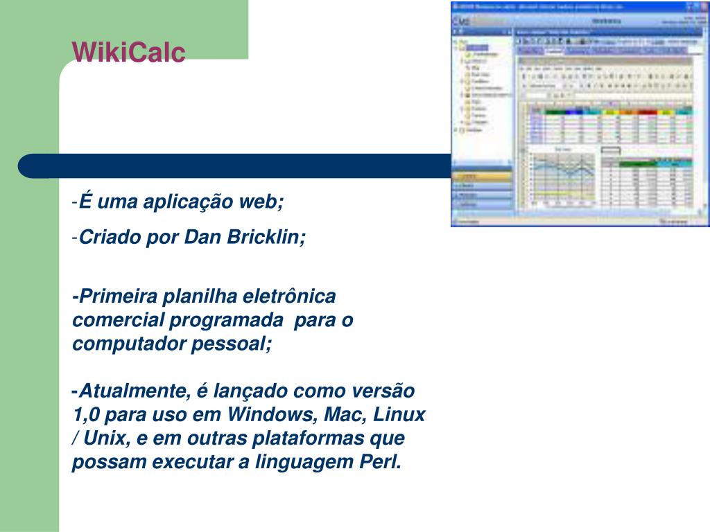 WikiCalc • É uma aplicação web; • Criado por Dan Bricklin; • -Primeira planilha eletrônica comercial programada para o computador pessoal; • -Atualmente, é lançado como versão 1,0 para uso em Windows, Mac, Linux / Unix, e em outras plataformas que possam executar a linguagem Perl.