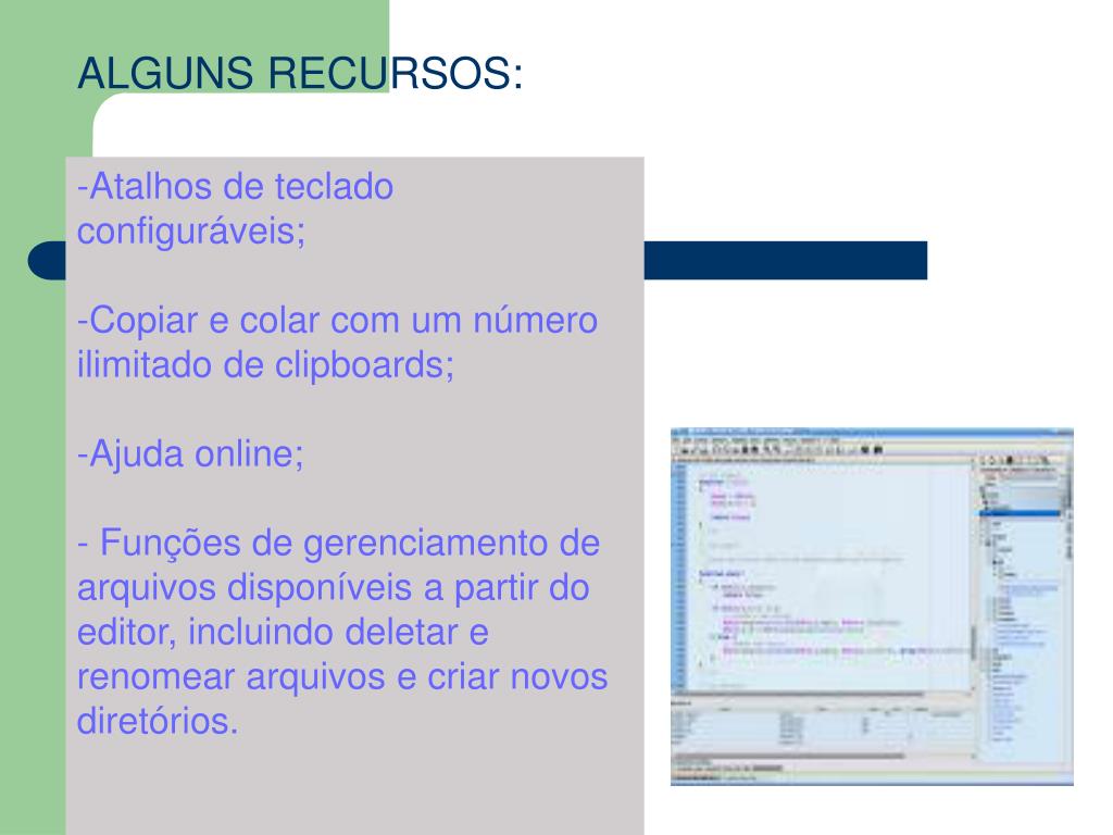 ALGUNS RECURSOS: • Atalhos de teclado configuráveis; • Copiar e colar com um número ilimitado de clipboards; • Ajuda online; • - Funções de gerenciamento de arquivos disponíveis a partir do editor, incluindo deletar e renomear arquivos e criar novos diretórios.
