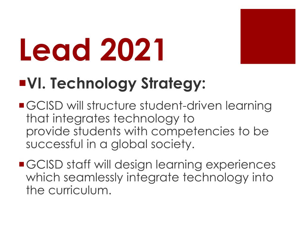 Lead 2021 VI. Technology Strategy: GCISD will structure student-driven learning that integrates technology to provide students with competencies to be successful in a global society. GCISD staff will design learning experiences which seamlessly integrate technology into the curriculum.