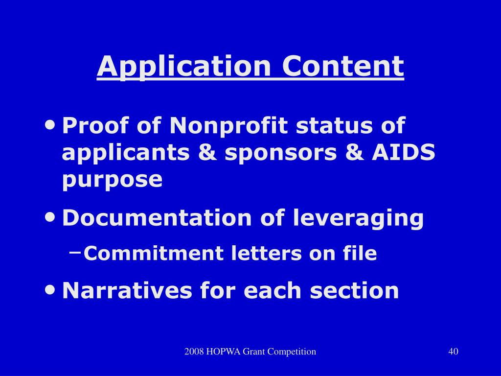 Application Content • Proof of Nonprofit status of applicants & sponsors & AIDS purpose • Documentation of leveraging • Commitment letters on file • Narratives for each section 2008 HOPWA Grant Competition