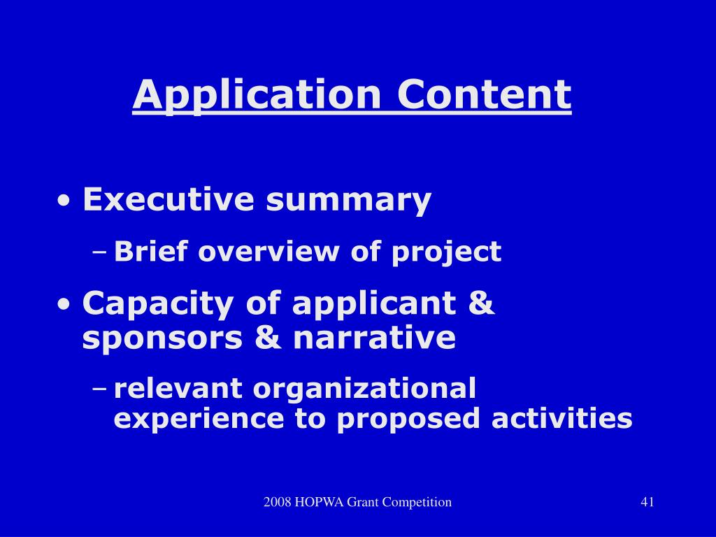 Application Content • Executive summary • Brief overview of project • Capacity of applicant & sponsors & narrative • relevant organizational experience to proposed activities 2008 HOPWA Grant Competition