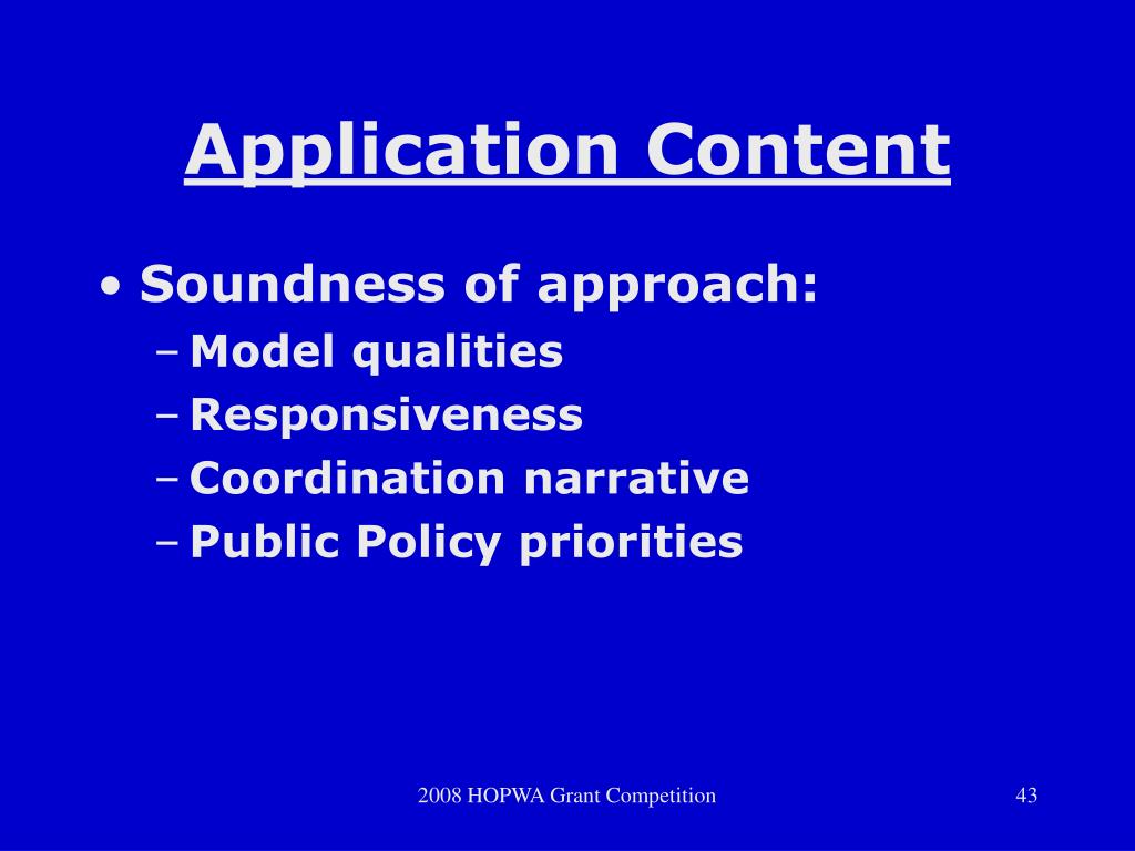 Application Content • Soundness of approach: • Model qualities • Responsiveness • Coordination narrative • Public Policy priorities 2008 HOPWA Grant Competition
