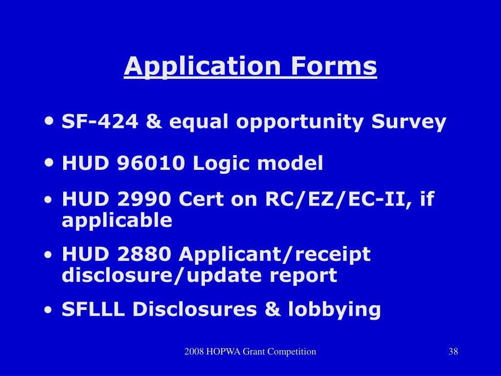Application Forms • SF-424 & equal opportunity Survey • HUD 96010 Logic model • HUD 2990 Cert on RC/EZ/EC-II, if applicable • HUD 2880 Applicant/receipt disclosure/update report • SFLLL Disclosures & lobbying 2008 HOPWA Grant Competition