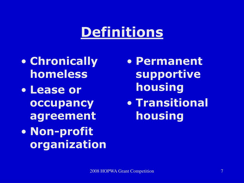 Chronically homeless Lease or occupancy agreement Non-profit organization Permanent supportive housing Transitional housing Definitions 2008 HOPWA Grant Competition
