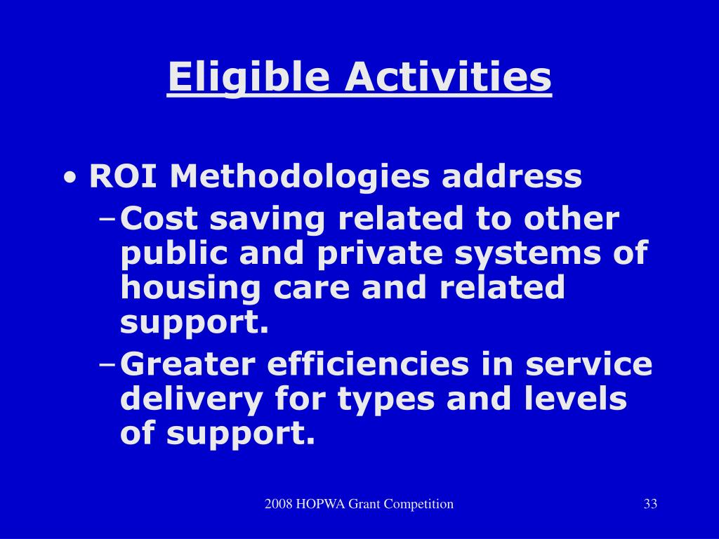 Eligible Activities • ROI Methodologies address • Cost saving related to other public and private systems of housing care and related support. • Greater efficiencies in service delivery for types and levels of support. 2008 HOPWA Grant Competition