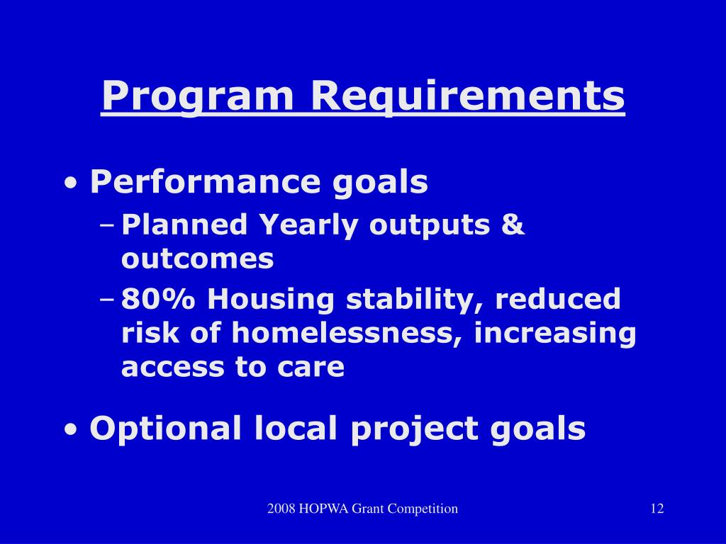 Program Requirements • Performance goals • Planned Yearly outputs & outcomes • 80% Housing stability, reduced risk of homelessness, increasing access to care • Optional local project goals 2008 HOPWA Grant Competition