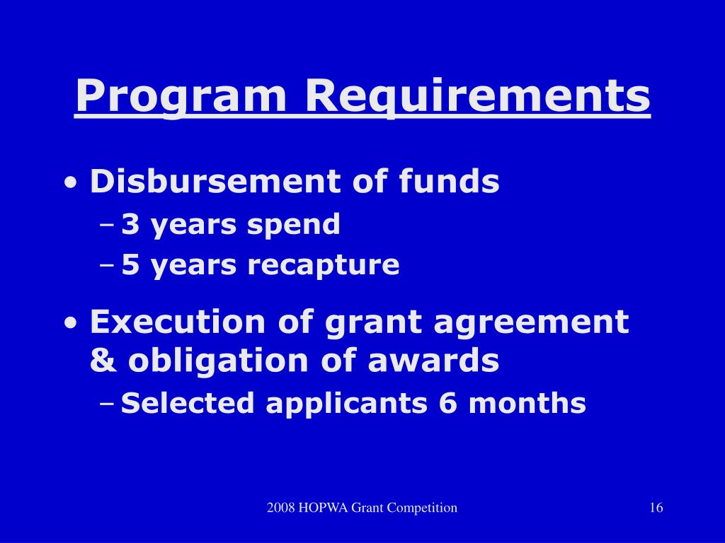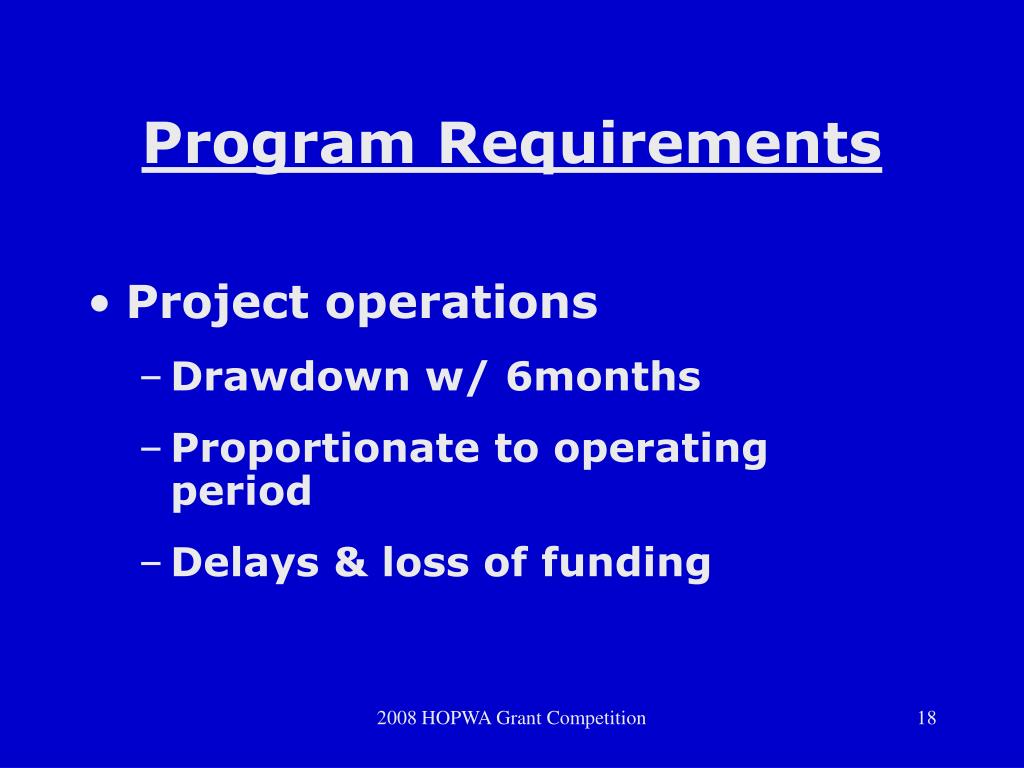 Program Requirements • Project operations • Drawdown w/ 6months • Proportionate to operating period • Delays & loss of funding 2008 HOPWA Grant Competition