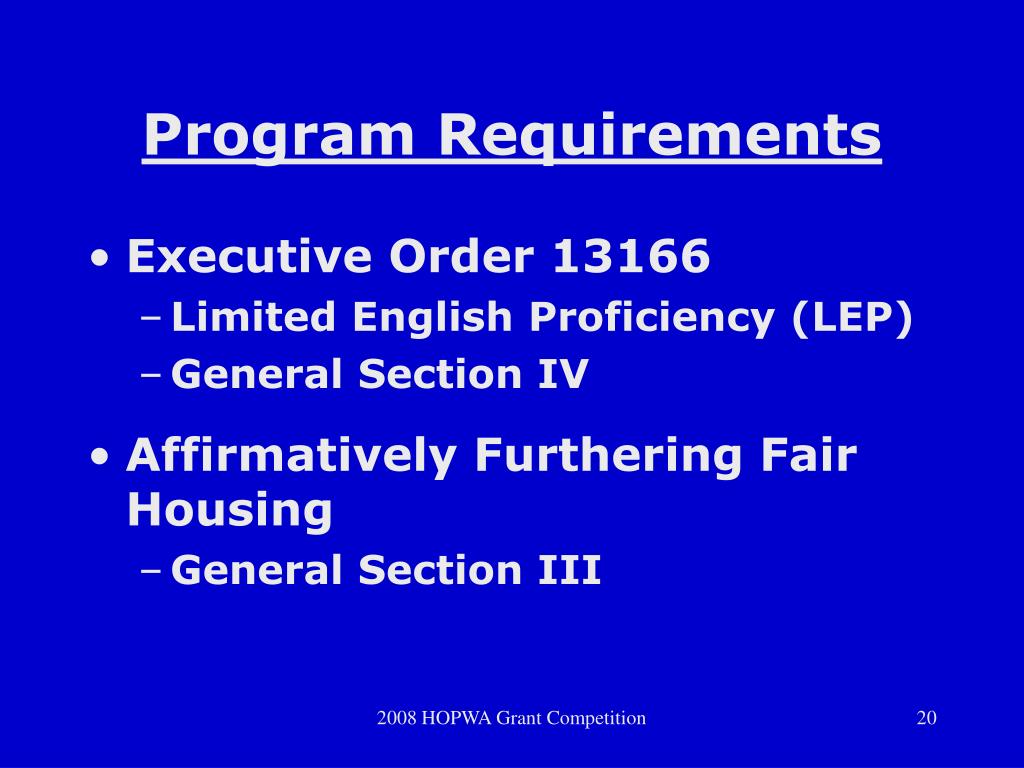 Program Requirements • Executive Order 13166 • Limited English Proficiency (LEP) • General Section IV • Affirmatively Furthering Fair Housing • General Section III 2008 HOPWA Grant Competition