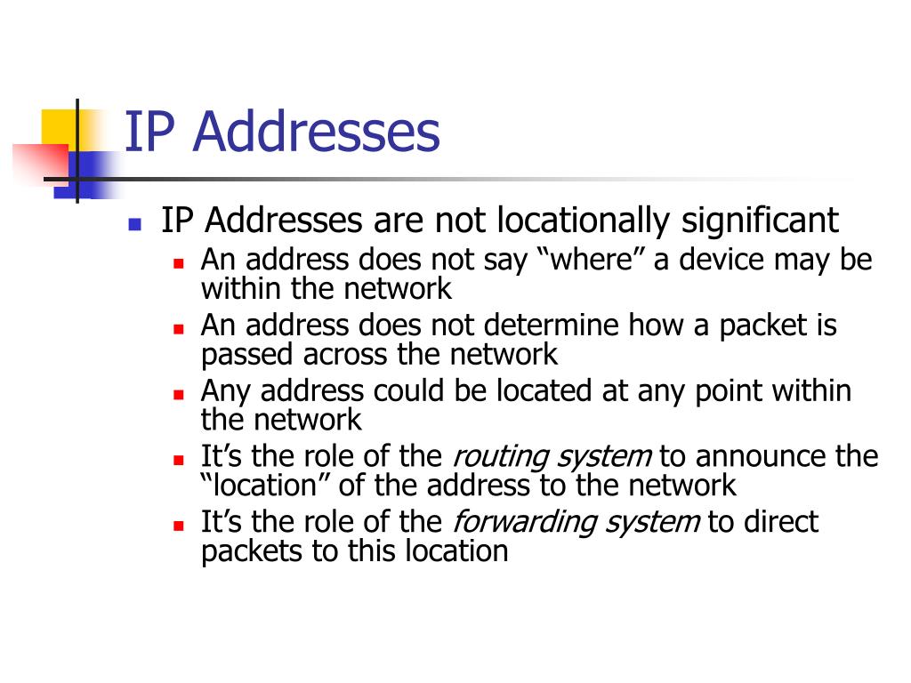 IP Addresses • IP Addresses are not locationally significant • An address does not say “where” a device may be within the network • An address does not determine how a packet is passed across the network • Any address could be located at any point within the network • It’s the role of the routing system to announce the “location” of the address to the network • It’s the role of the forwarding system to direct packets to this location