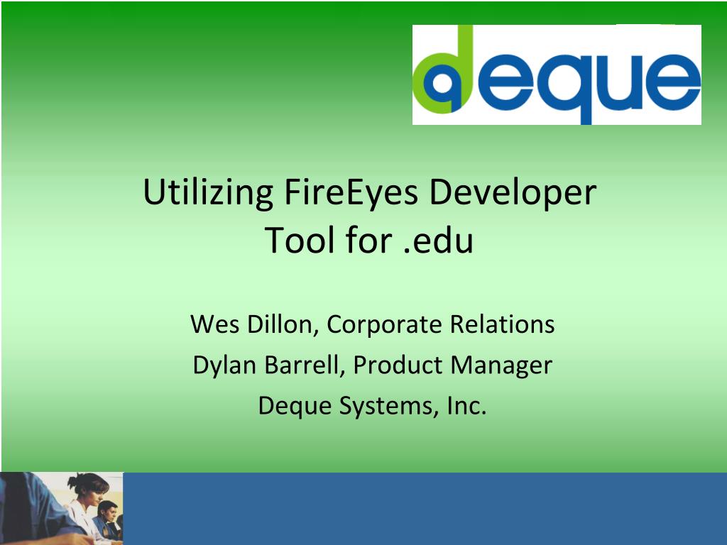 Utilizing FireEyes Developer Tool for .edu Wes Dillon, Corporate Relations Dylan Barrell, Product Manager Deque Systems, Inc.