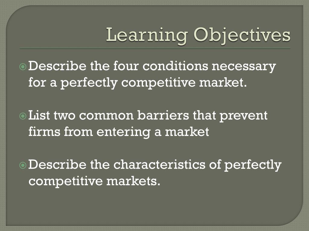 Learning Objectives Describe the four conditions necessary for a perfectly competitive market. List two common barriers that prevent firms from entering a market Describe the characteristics of perfectly competitive markets.