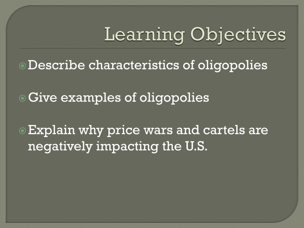 Learning Objectives Describe characteristics of oligopolies Give examples of oligopolies Explain why price wars and cartels are negatively impacting the U.S.