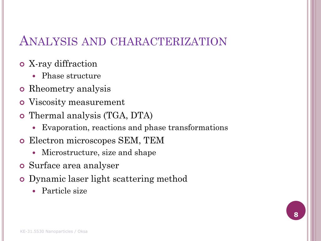 Analysis and characterization • X-ray diffraction • Phase structure • Rheometry analysis • Viscosity measurement • Thermal analysis (TGA, DTA) • Evaporation, reactions and phase transformations • Electron microscopes SEM, TEM • Microstructure, size and shape • Surface area analyser • Dynamic laser light scattering method • Particle size