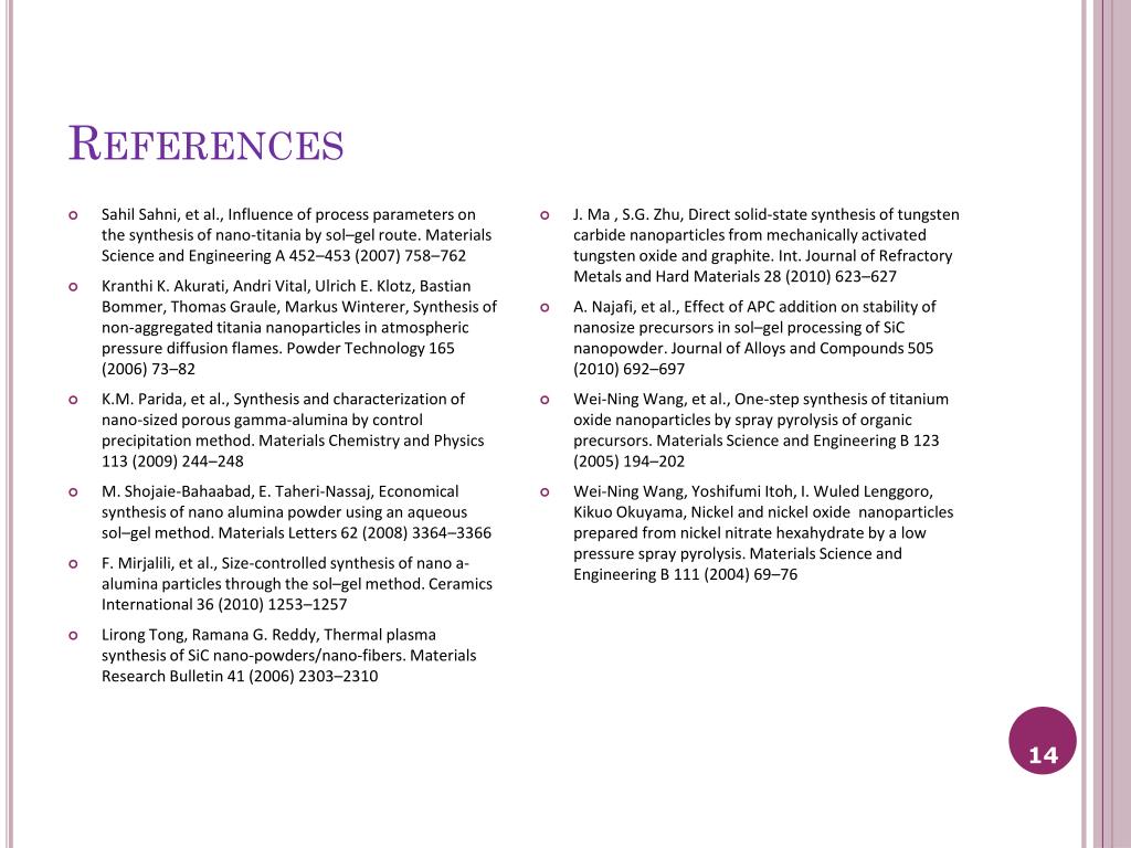 References • Sahil Sahni, et al., Influence of process parameters on the synthesis of nano-titania by sol–gel route. Materials Science and Engineering A 452–453 (2007) 758–762 • Kranthi K. Akurati, Andri Vital, Ulrich E. Klotz, Bastian Bommer, Thomas Graule, Markus Winterer, Synthesis of non-aggregated titania nanoparticles in atmospheric pressure diffusion flames. Powder Technology 165 (2006) 73–82 • K.M. Parida, et al., Synthesis and characterization of nano-sized porous gamma-alumina by control precipitation method. Materials Chemistry and Physics 113 (2009) 244–248 • M. Shojaie-Bahaabad, E. Taheri-Nassaj, Economical synthesis of nano alumina powder using an aqueous sol–gel method. Materials Letters 62 (2008) 3364–3366 • F. Mirjalili, et al., Size-controlled synthesis of nano a-alumina particles through the sol–gel method. Ceramics International 36 (2010) 1253–1257 • Lirong Tong, Ramana G. Reddy, Thermal plasma synthesis of SiC nano-powders/nano-fibers. Materials Research Bulletin 41 (2006) 2303–2310 • J. Ma , S.G. Zhu, Direct solid-state synthesis of tungsten carbide nanoparticles from mechanically activated tungsten oxide and graphite. Int. Journal of Refractory Metals and Hard Materials 28 (2010) 623–627 • A. Najafi, et al., Effect of APC addition on stability of nanosize precursors in sol–gel processing of SiC nanopowder. Journal of Alloys and Compounds 505 (2010) 692–697 • Wei-Ning Wang, et al., One-step synthesis of titanium oxide nanoparticles by spray pyrolysis of organic precursors. Materials Science and Engineering B 123 (2005) 194–202 • Wei-Ning Wang, Yoshifumi Itoh, I. Wuled Lenggoro, Kikuo Okuyama, Nickel and nickel oxide nanoparticles prepared from nickel nitrate hexahydrate by a low pressure spray pyrolysis. Materials Science and Engineering B 111 (2004) 69–76