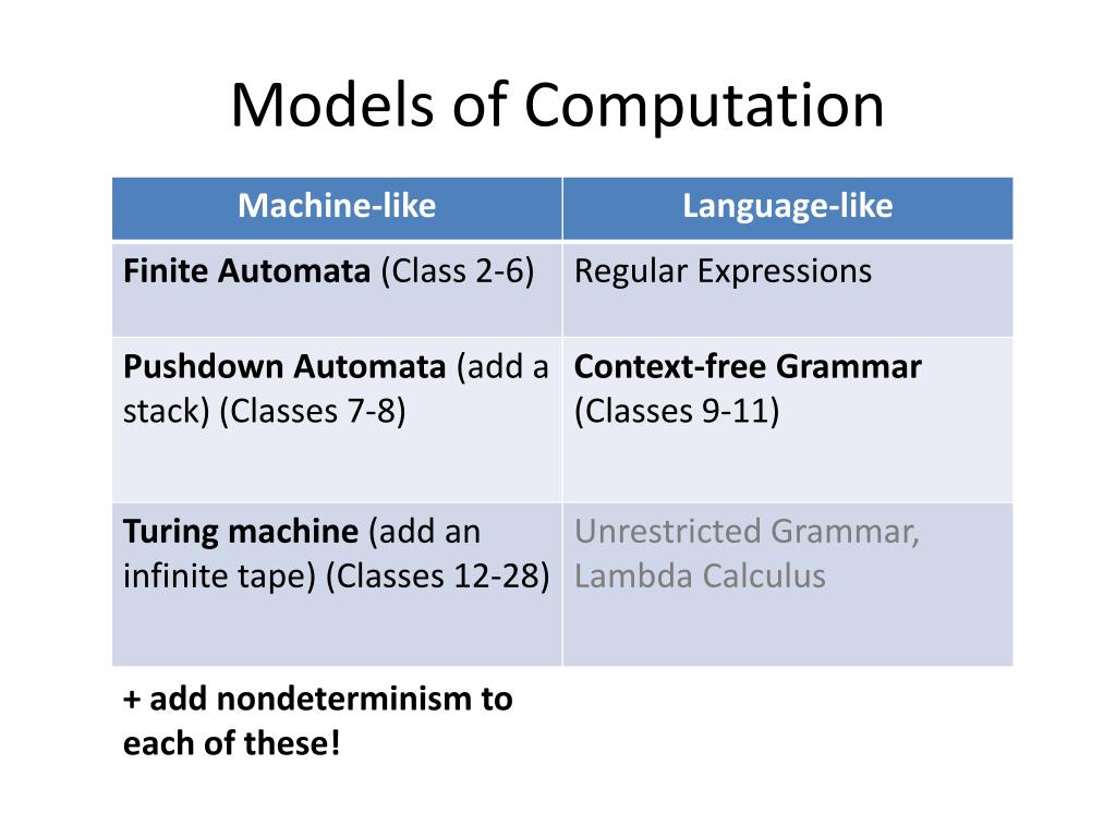 Assignments • Reading: mostly from Sipser, some additional readings later • Problem Sets (7): PS1 is posted now, due Tuesday, Feb 2 • Exams (2 + final): • First exam will be in-class March 2, one page of notes allowed • Second exam will (probably) be take home, April 8-13 • Final exam