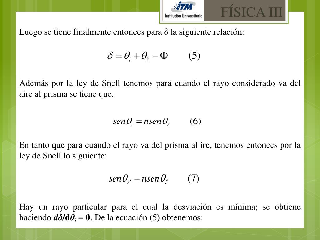 FÍSICA III Luego se tiene finalmente entonces para δ la siguiente relación: Además por la ley de Snell tenemos para cuando el rayo considerado va del aire al prisma se tiene que: En tanto que paracuando el rayova del prisma al ire, tenemosentoncespor la ley de Snell lo siguiente: Hay un rayo particular para el cual la desviación es mínima; se obtiene haciendo dδ/dθi= 0. De la ecuación (5) obtenemos: