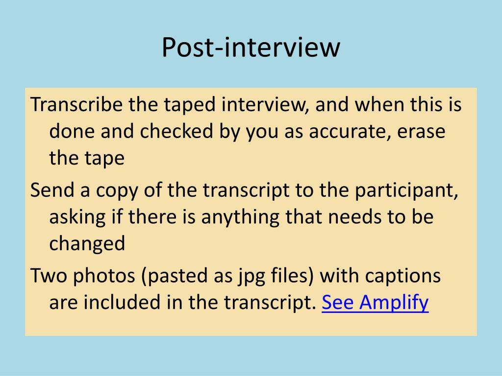 Post-interview Transcribe the taped interview, and when this is done and checked by you as accurate, erase the tape Send a copy of the transcript to the participant, asking if there is anything that needs to be changed Two photos (pasted as jpg files) with captions are included in the transcript. See Amplify