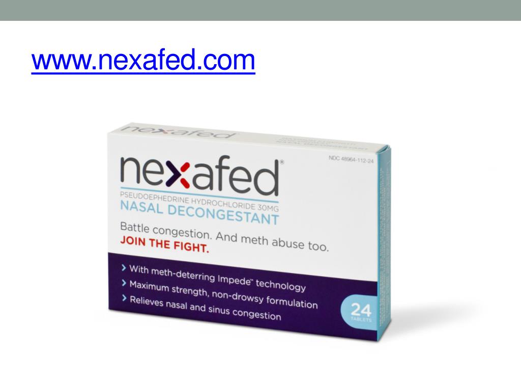 Why Nexafed? • Crushed pseudoephedrine (PSE) tablets are easily dissolved in water or other liquids, and filtered to obtain purified PSE. • Impede technology incorporates a unique polymer matrix of inactive ingredients that form a thick gel that, in independent laboratory tests, has been shown to disrupt the extraction and conversion of PSE into methamphetamine.