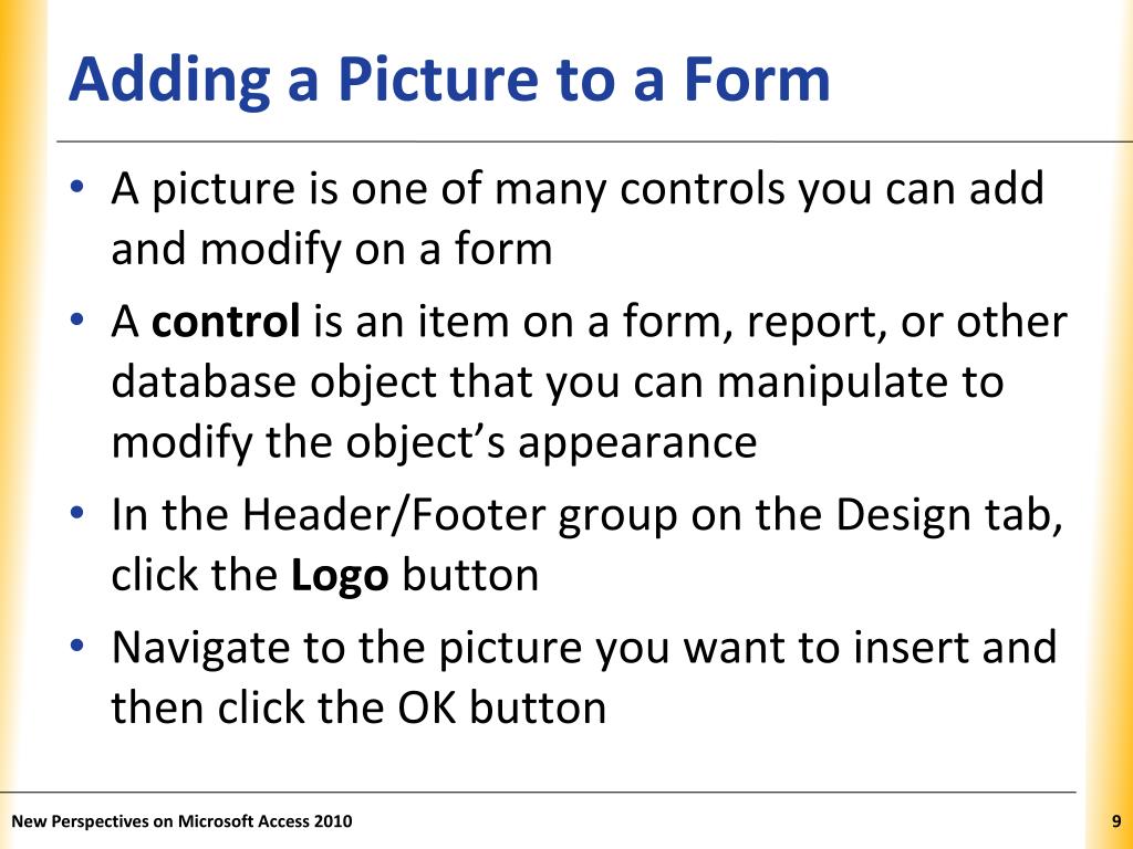 Adding a Picture to a Form • A picture is one of many controls you can add and modify on a form • A control is an item on a form, report, or other database object that you can manipulate to modify the object’s appearance • In the Header/Footer group on the Design tab, click the Logo button • Navigate to the picture you want to insert and then click the OK button New Perspectives on Microsoft Access 2010