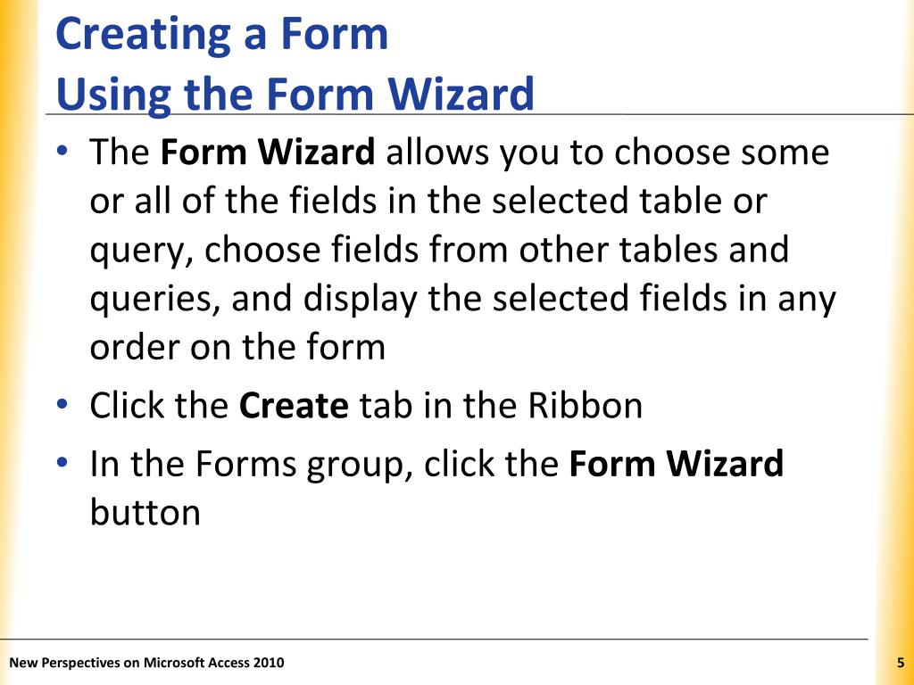 Creating a Form Using the Form Wizard • The Form Wizard allows you to choose some or all of the fields in the selected table or query, choose fields from other tables and queries, and display the selected fields in any order on the form • Click the Create tab in the Ribbon • In the Forms group, click the Form Wizard button New Perspectives on Microsoft Access 2010