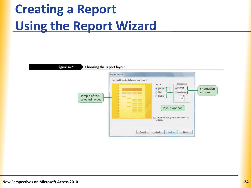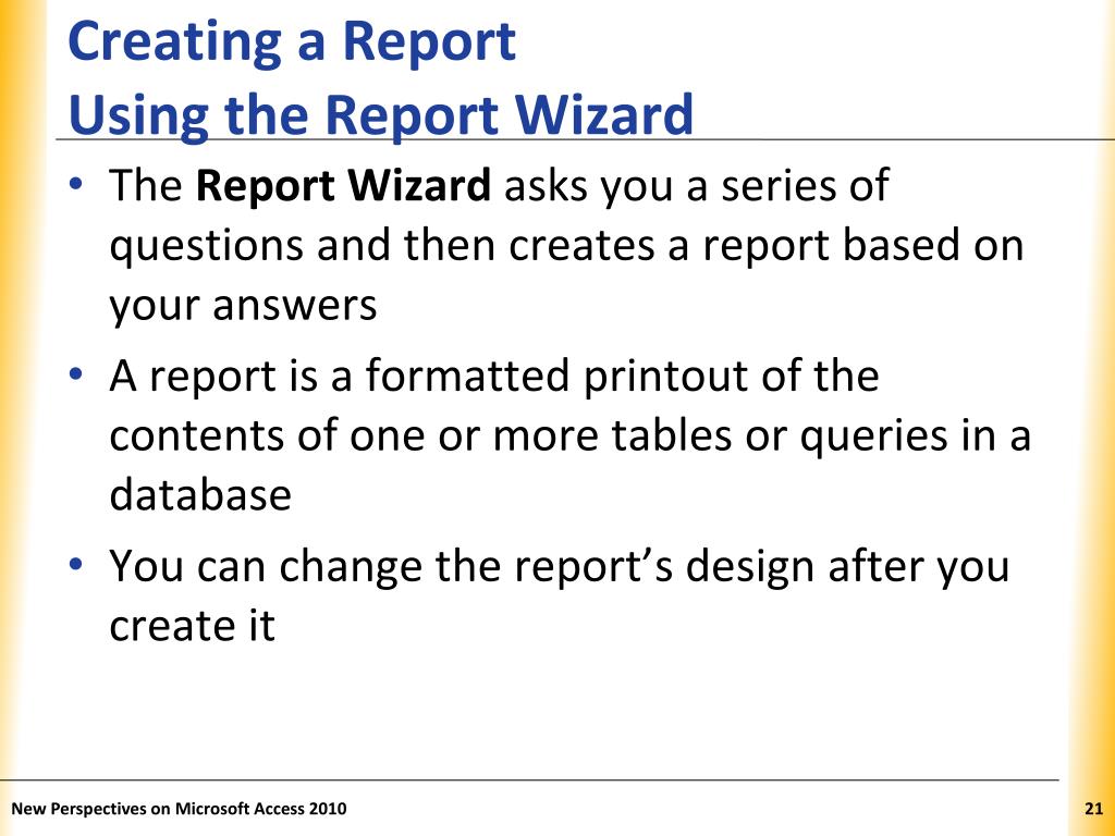 Creating a Report Using the Report Wizard • Click the Create tab on the Ribbon • In the Reports group on the Create tab, click the Report Wizard button New Perspectives on Microsoft Access 2010