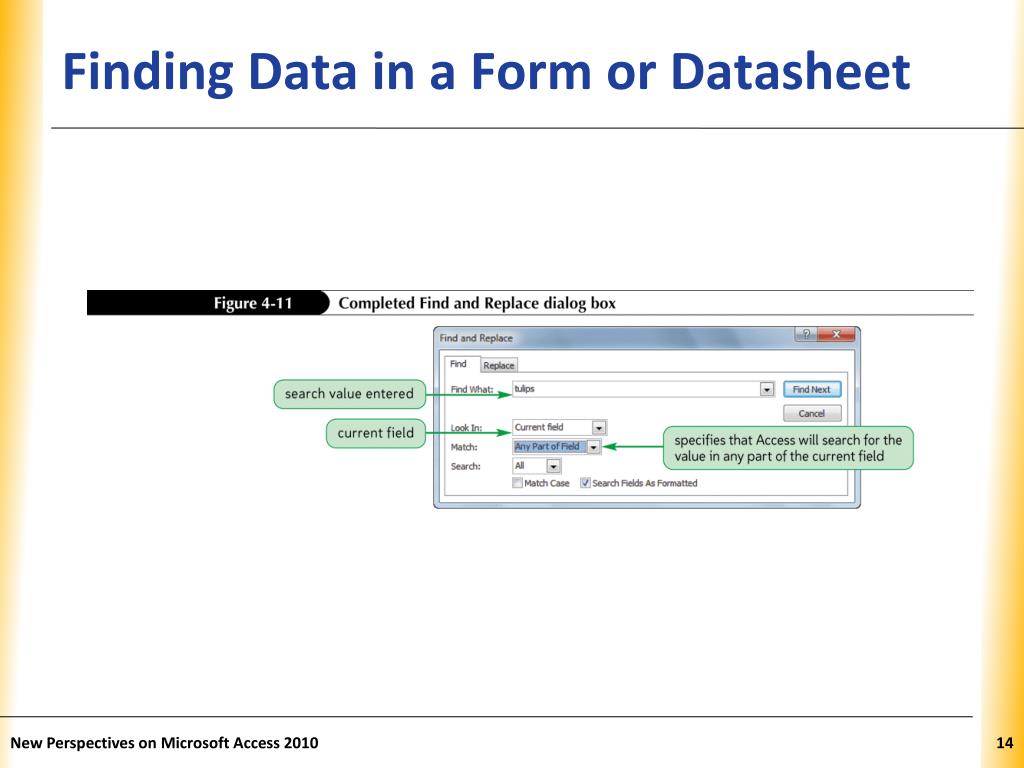 Finding Data in a Form or Datasheet • Open the form or datasheet, and then select the field you want to search • In the Find group on the Home tab, click the Find button to open the Find and Replace dialog box • In the Find What box, type the field value you want to find • Complete the remaining options, as necessary, to specify the type of search to conduct • Click the Find Next button to begin the search • Click the Find Next button to continue searching for the next match • Click the Cancel button to stop the search operation New Perspectives on Microsoft Access 2010