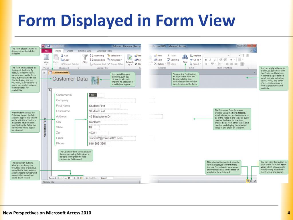 Objectives • Create a form using the Form Wizard • Apply a theme to a form • Add a picture to a form • Change the color and line type of items on a form • Find and maintain data using a form • Preview and print selected form records New Perspectives on Microsoft Access 2010