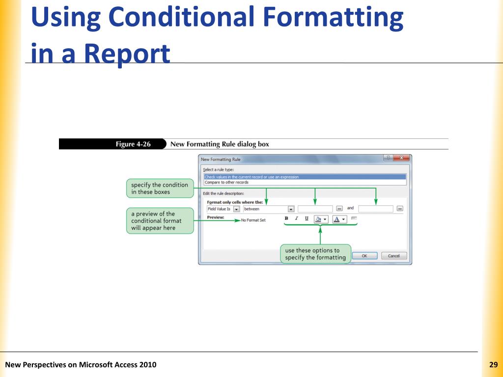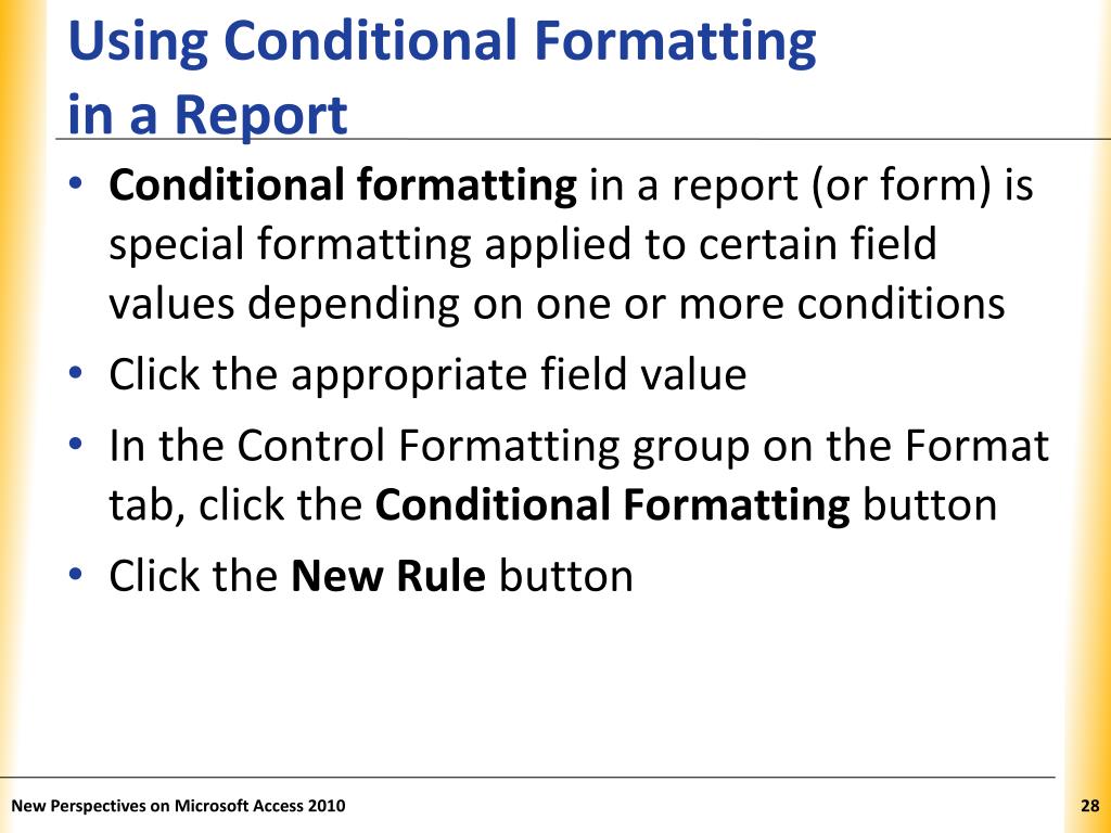 Using Conditional Formatting in a Report • Conditional formatting in a report (or form) is special formatting applied to certain field values depending on one or more conditions • Click the appropriate field value • In the Control Formatting group on the Format tab, click the Conditional Formatting button • Click the New Rule button New Perspectives on Microsoft Access 2010