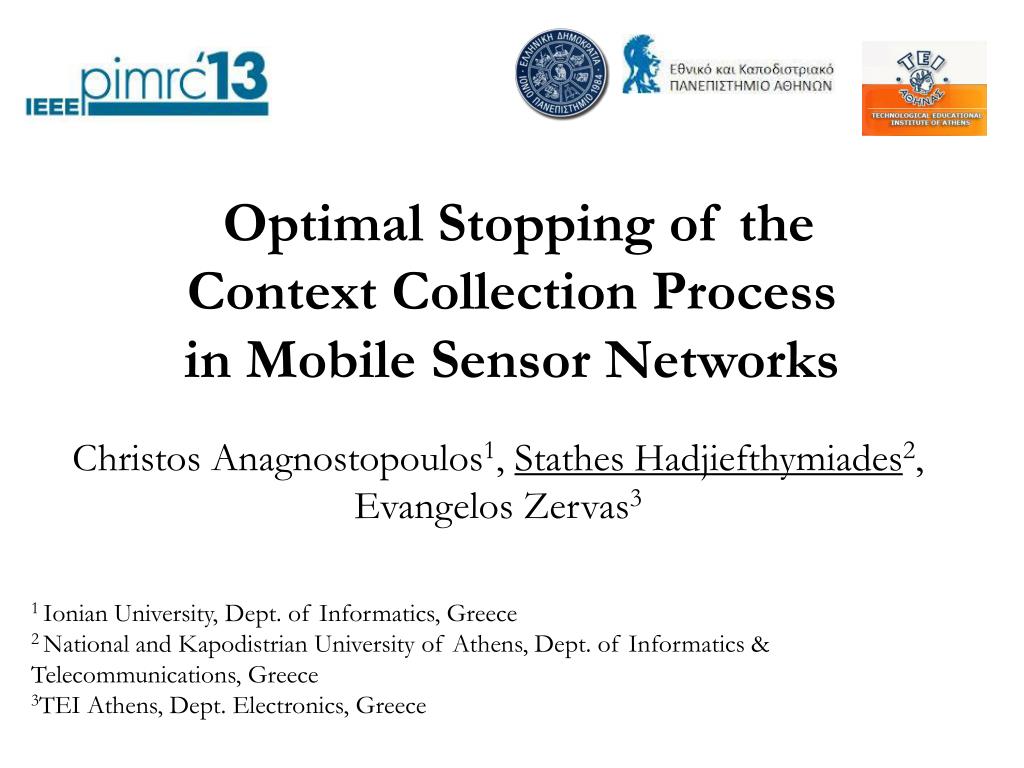 Optimal Stopping of the Context Collection Processin Mobile Sensor Networks Christos Anagnostopoulos1, Stathes Hadjiefthymiades2, Evangelos Zervas3 1 Ionian University, Dept. of Informatics, Greece 2 National and Kapodistrian University of Athens, Dept. of Informatics & Telecommunications, Greece 3TEI Athens, Dept. Electronics, Greece