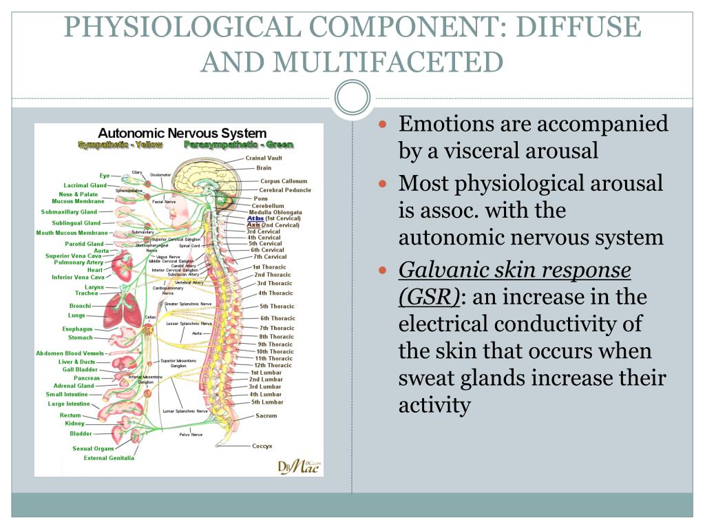 PHYSIOLOGICAL COMPONENT: DIFFUSE AND MULTIFACETED Emotions are accompanied by a visceral arousal Most physiological arousal is assoc. with the autonomic nervous system Galvanic skin response(GSR): an increase in the electrical conductivity of the skin that occurs when sweat glands increase their activity