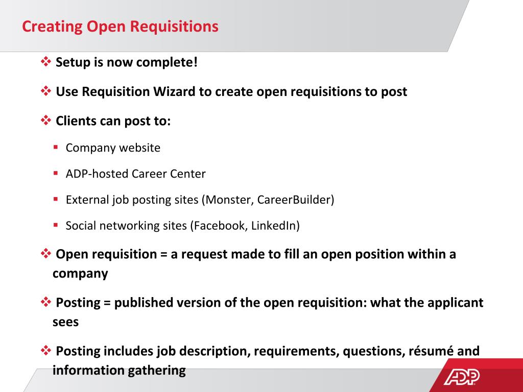 Creating Open Requisitions • Setup is now complete! • Use Requisition Wizard to create open requisitions to post • Clients can post to: • Company website • ADP-hosted Career Center • External job posting sites (Monster, CareerBuilder) • Social networking sites (Facebook, LinkedIn) • Open requisition = a request made to fill an open position within a company • Posting = published version of the open requisition: what the applicant sees • Posting includes job description, requirements, questions, résumé and information gathering
