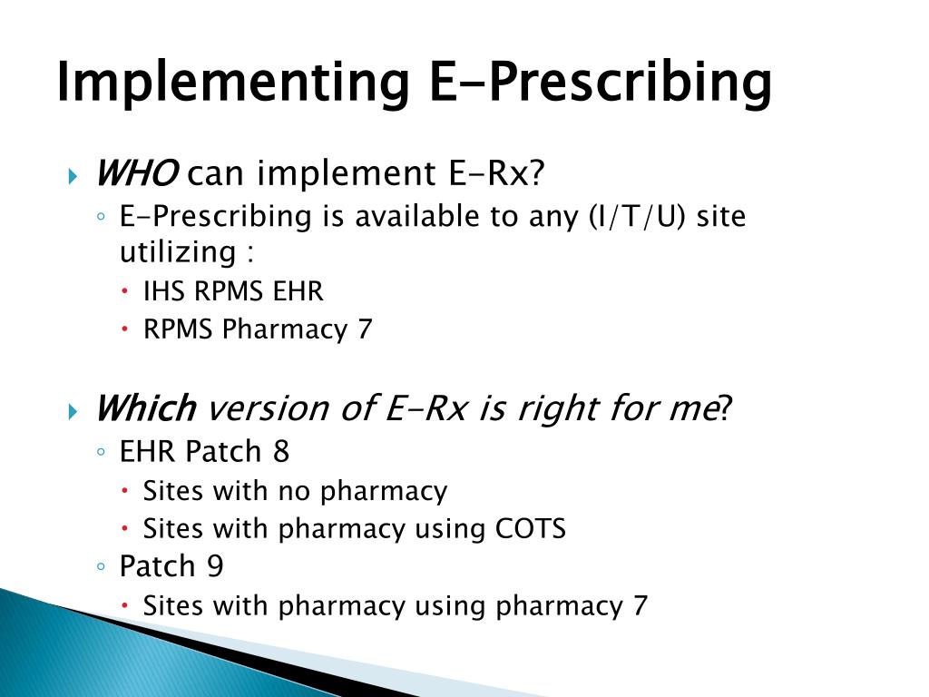 Implementing E-Prescribing • WHO can implement E-Rx? • E-Prescribing is available to any (I/T/U) site utilizing : • IHS RPMS EHR • RPMS Pharmacy 7 • Which version of E-Rx is right for me? • EHR Patch 8 • Sites with no pharmacy • Sites with pharmacy using COTS • Patch 9 • Sites with pharmacy using pharmacy 7